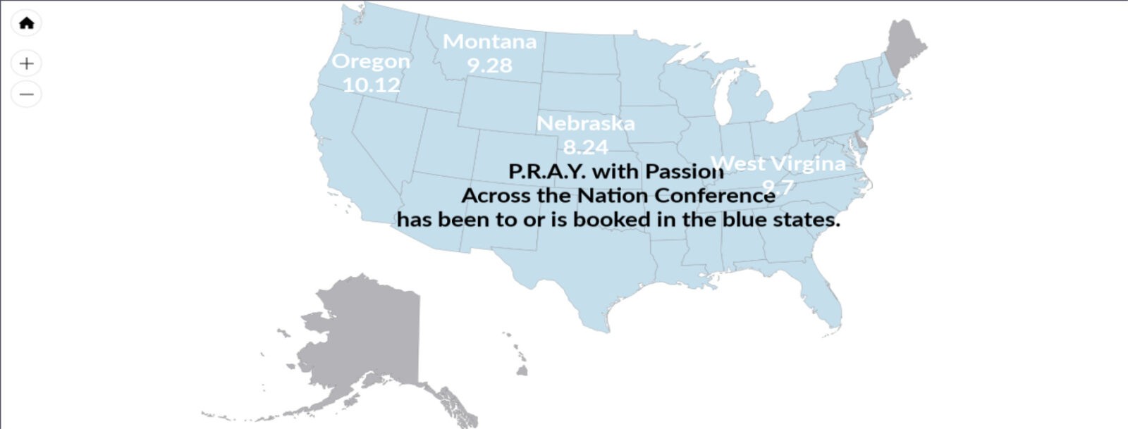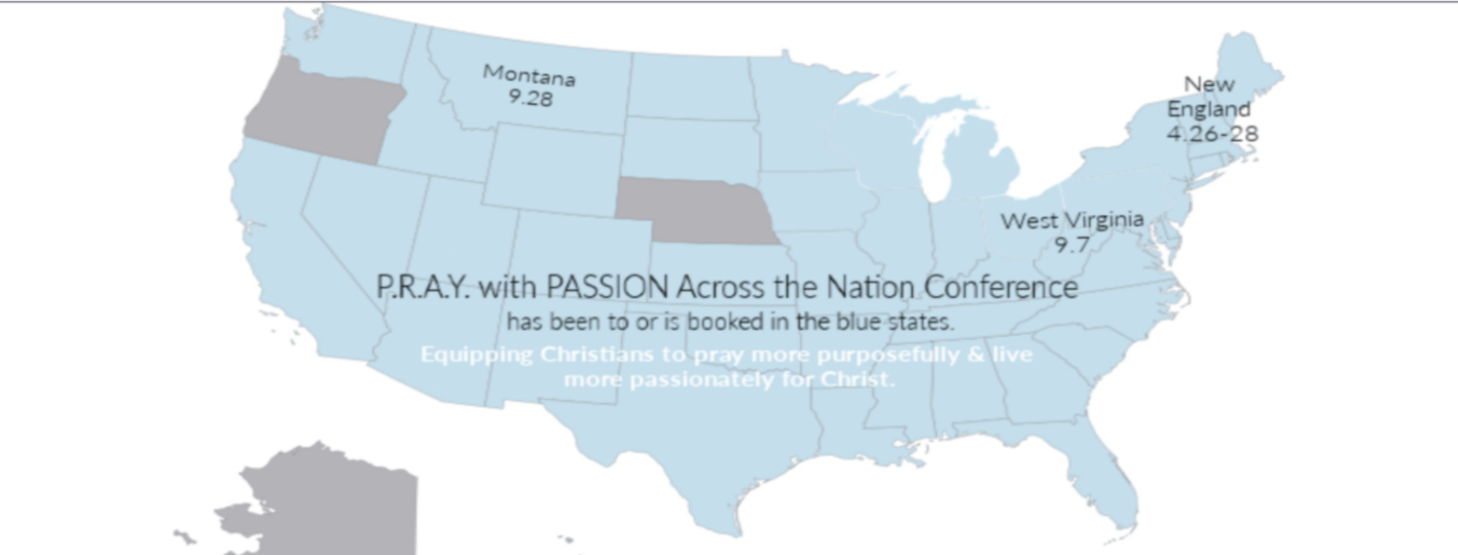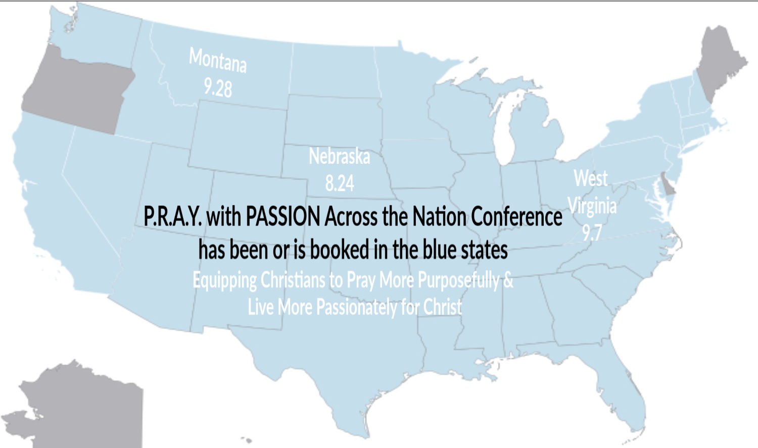 Here is something I continue to be excited about. God woke me at 4 a.m. several years ago and stirred my heart to take the message of Pray with Purpose, Live with Passion, as a conference to women throughout the nation. It was as if He whispered, “My daughters throughout the nation are hurting and depressed. The tools I gave you in Pray With Purpose, Live with Passion work. Take the conference to them.”  I didn’t hear a real voice. But, whatever word you use for how God stirs us to act – “nudges,” “moves,” “prompts” – that’s what He did. The blue states are where I’ve held the conference or it is scheduled. The heartbeat of P.R.A.Y. With Passion Across the Nation is to inspire you to live passionately for Christ and equip you to pray more purposefully.