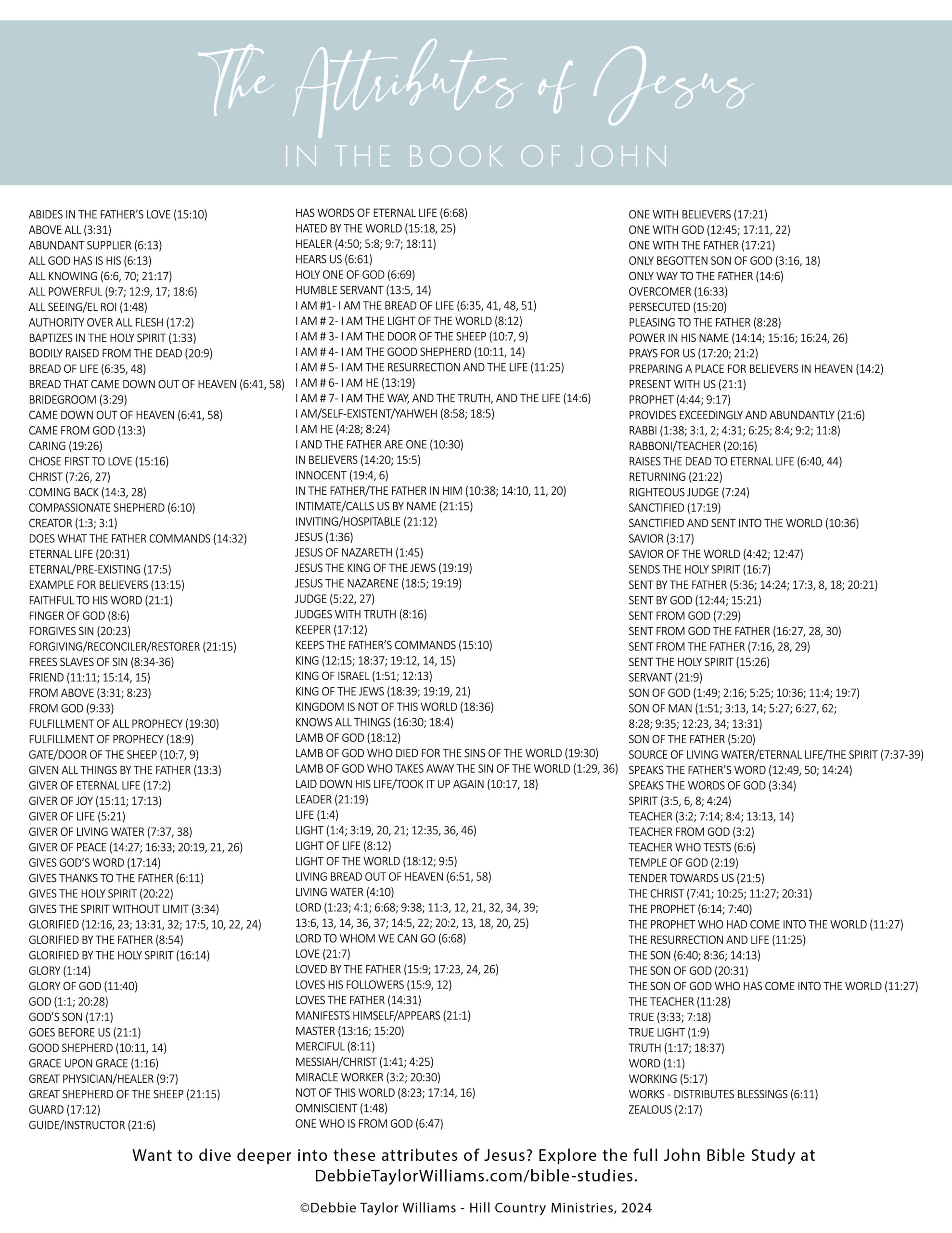 Click below to download a free printable of the attributes of Jesus in the book of John. The corresponding chapter(s) and verse(s) for each attribute are included.