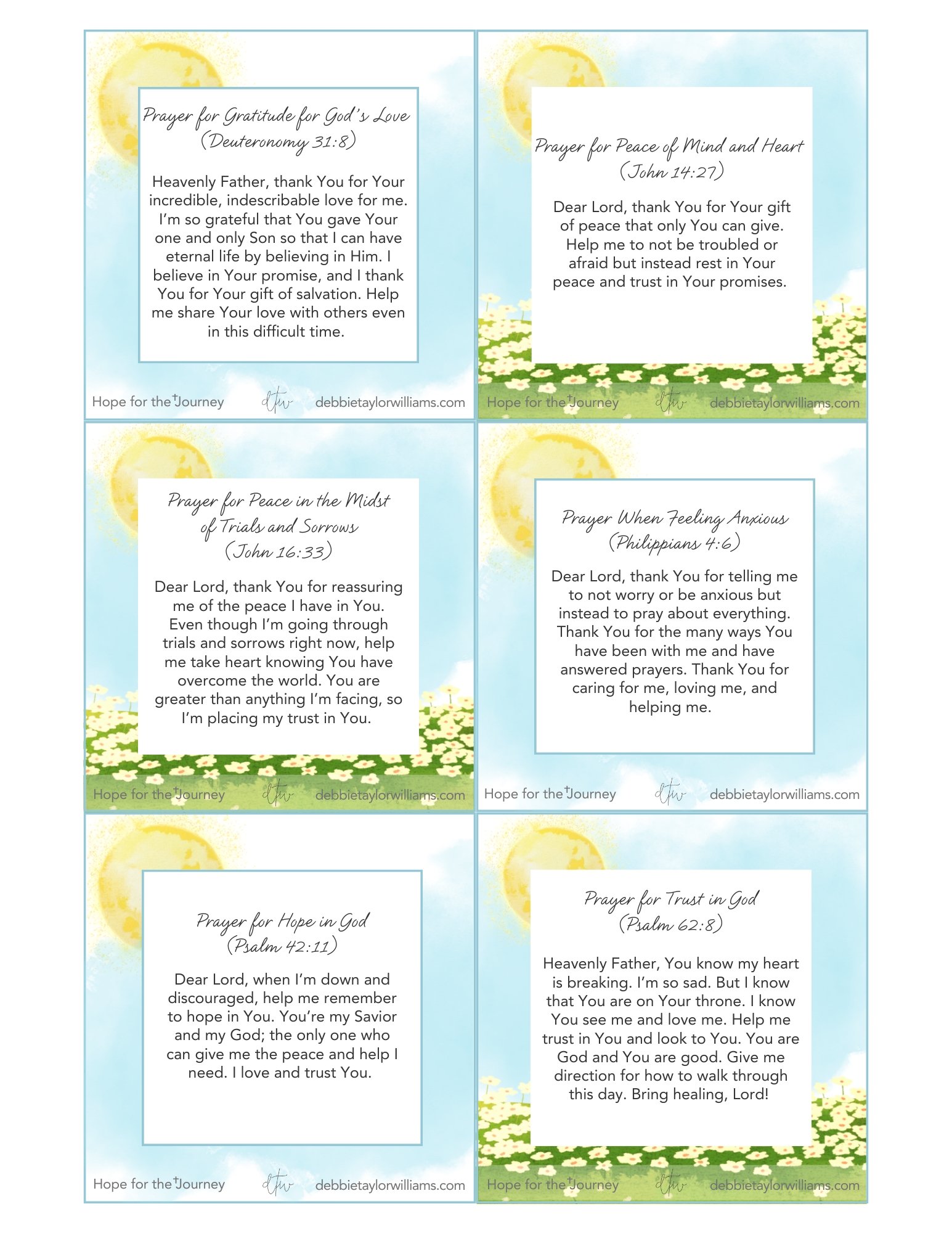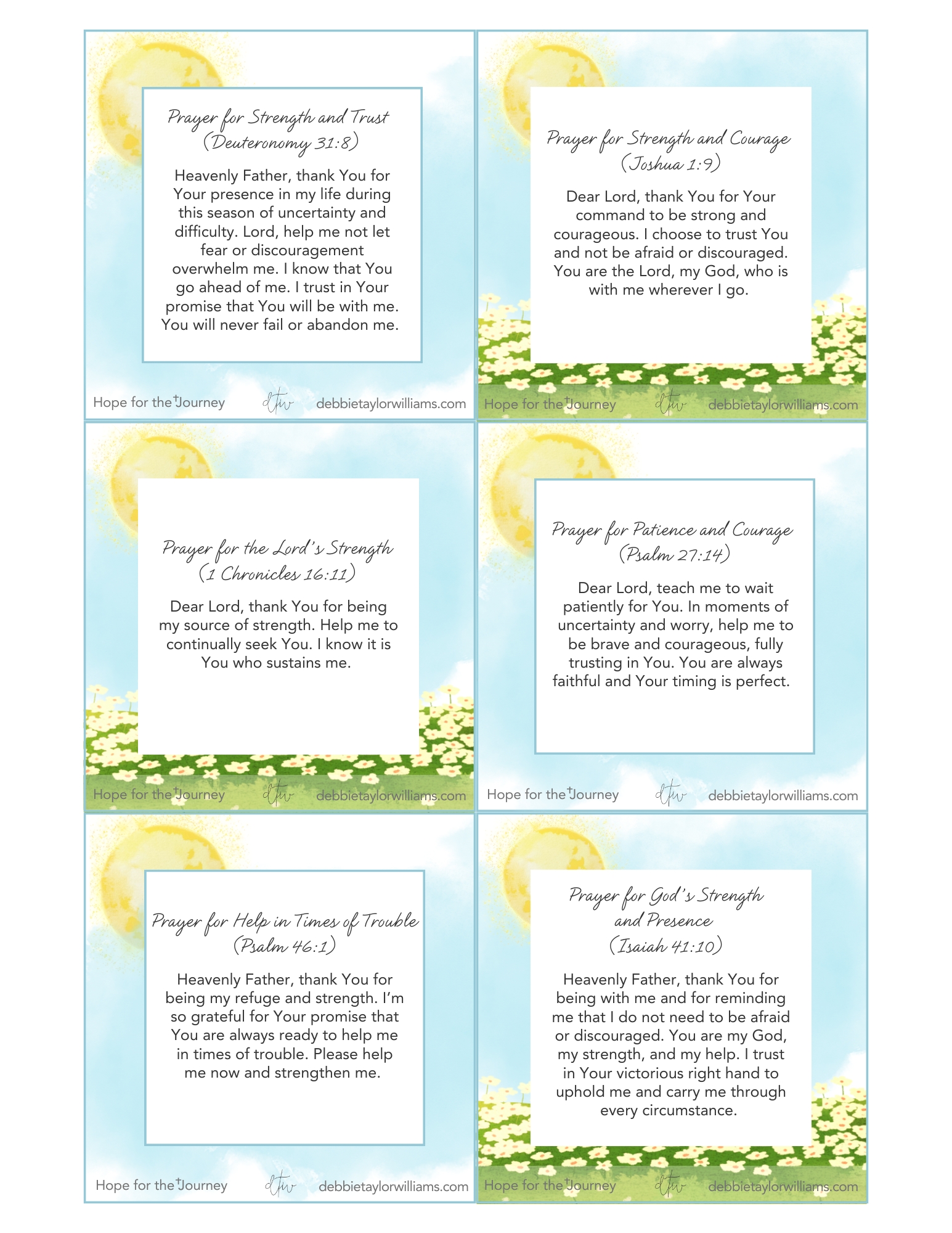 Download, Save, Print, and Use: Click the button below to download the prayer cards. Once saved, print and cut out the prayer cards. Keep them in your purse or wallet, use them as bookmarks, place them in your office, or share them with someone who needs encouragement.